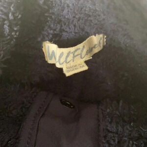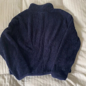 This is a soft medium navy blue fleece in a size medium. Has two pockets in the front with three buttons at the top. Pit pit 19 inches.