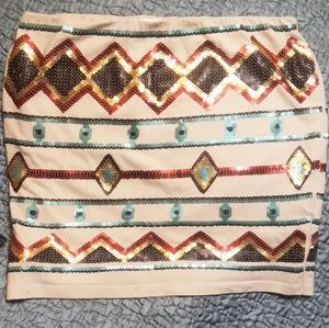 Navajo Sequence miniskirt, with a southwestern kick to it! 💕 100% polyester 60% cotton lining. 100% Polyester. Size M. Measurements laying flat 14" L from waist to bottom cz