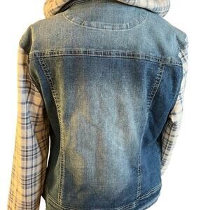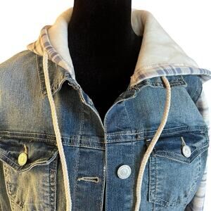 Wallflower women’s denim jacket. Size M. The Dreamer fit. Features a plaid hood with drawstring and matching sleeves. The hood and sleeves are lined with plush fabric. That is extremely soft. The jacket has button front and two chest pockets with flaps and buttons. Two hand pockets by waist. The jacket is made of cotton, polyester and spandex blend. This is a super cute and plush little jacket. * Runs a bit small.