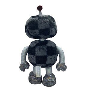 This plush robot toy features a fun and playful design with heart-shaped glasses and a sequin heart detail. Its soft, checkered pattern is complemented by iridescent accents for an eye-catching appearance. Perfect as a decorative piece or a unique gift for children ages 3 and up.