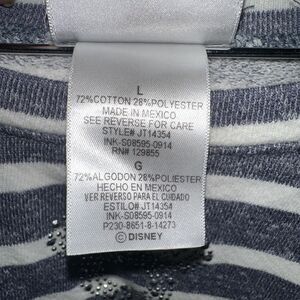 This Walt Disney Cruise Line Studded Mickey Mouse Anchor Lightweight Sweatshirt in size L features a striped pattern with a round neckline and long sleeves with raglan sleeves. Made from a blend of polyester and cotton, this knit sweatshirt comes in blue and ivory colors with studded accents and the Disney Cruise Line logo. Perfect for casual occasions, this lightweight sweatshirt has a regular fit and is part of the Disney Cruise Line theme. Ideal for women who are fans of Disney and want to show off their love for the brand.