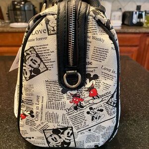 Mickey Mouse news clippings barrel purse. New with tags. Comes with strap.