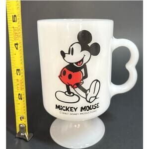 .This is a vintage white ceramic pedestal mug featuring Mickey Mouse from Walt Disney. The mug has a round shape and can hold up to 8 ounces of your favorite beverage. It is an antique style mug and has a design that is perfect for collectors and fans alike. The mug is dishwasher safe and machine washable. It is a branded product from Walt Disney and is a part of the Mickey Mouse character family. The mug can be used for drinking or for display purposes. It is perfect for those who love Disney and want to add a touch of nostalgia to their drinkware collection.