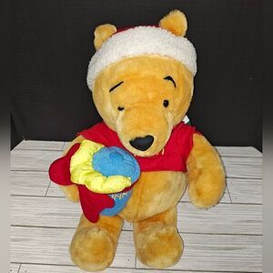 Walt Disney Vintage Christmas Winnie The Pooh Bear Plush 15" Holding Hunny Jar. Has some wear from age use and storage. See pictures. Sold as is.