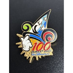 This Walt Disney World trading pin celebrates 100 Years of Magic and features the iconic Sorcerer's Apprentice hat. The pin was released in 2002 and is part of the Disneyana collection. It is a single pin that was manufactured in China and is part of the franchise's celebration of Walt Disney's 100th birthday.