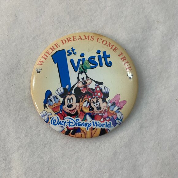 Disney Collectors celebrate Walt Disney World with this vintage collectible "1st Visit" button pin featuring beloved Disney characters Mickey Mouse, Minnie Mouse, Goofy, Donald Duck, and Daisy Duck.