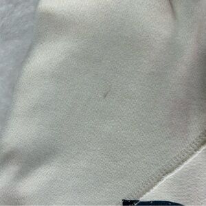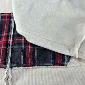 Cream Disney hoodie with black text and red plaid pocket. Features full zip and drawstring hood.