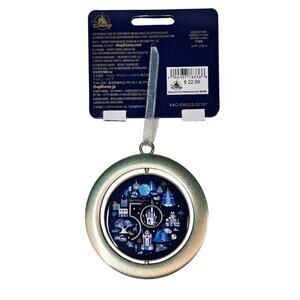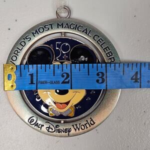 This is a BRAND NEW Christmas tree ornament that can be hung year-round with other Disney memorabilia. It is unique in that it has two circular pieces with an inside circle that spins. The ornament is sort of heavy and feels well made. A ribbon is attached for hanging. One side of the inside circle has Mickey's face, and the other side has a "50" over some places in Disney. The outer circle says, "The World's Most Magical Celebration" and "Walt Disney World." This is a great piece commemorating Walt Disney world's 50th anniversary celebration that would be a great addition for the Disney collector!