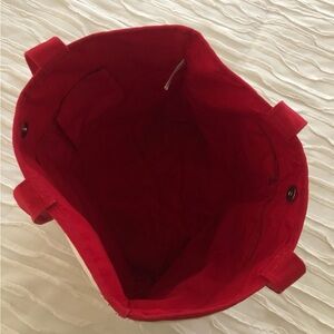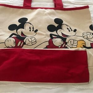 Like new cotton bag featuring Walt Disney World logo. Red embroidery and trim. 3 pockets inside with one zippered. Snap closure. 12” drop on handle. Lying flat tote measures 19” x 15”. Bottom measures 13” x 5”. Great for travel, beach, kids toys, or market shopping.