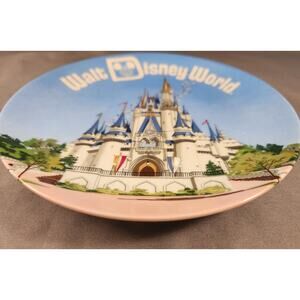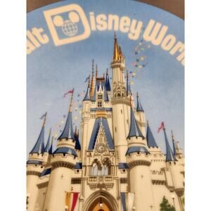 Vintage Walt Disney World Cinderella Castle decorative plate, made in Japan. Features a full-color image of the iconic Magic Kingdom castle with a blue sky and “Walt Disney World” in bold across the top. Measures approximately 6.5 inches in diameter.