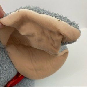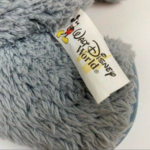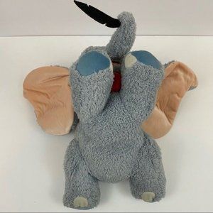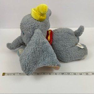 Walt Disney World WDW Dumbo Elephant Plush Toy. Dumbo elephant stuffed animal laying down with yellow hat, circus collar and holding a feather. Theme park amusement park souvenir. Ears have several stain spots.