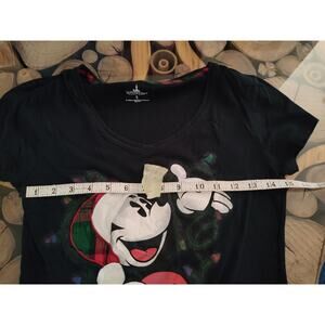 Walt Disney World Holiday Mickey Mouse t-shirt graphic lights Santa hat plaid, in fair pre-owned condition Pilling and fading throughout and holes in front (pictured) Marked as a women's size small, measurements are taken while laying flat and are approximate ( see photos)