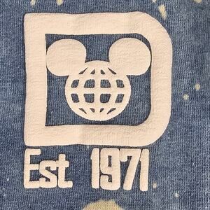 This is a BRAND NEW matching set from Walt Disney World. It consists of a long-sleeved jersey that is blue with white spots, giving it a bleached look, and a matching headband with Minnie Mouse ears. The ears are the same blue and have the bleached spots like the shirt. Since these are Minnie ears, there has to be a bow! The bow is a pretty lilac. The shirt is made of thick, 100% cotton. It is perfect to wear on the "cooler" winter days at Disney. It would be the PERFECT Christmas gift for someone who has a Walt Disney World trip on the horizon! Women's Size Large.