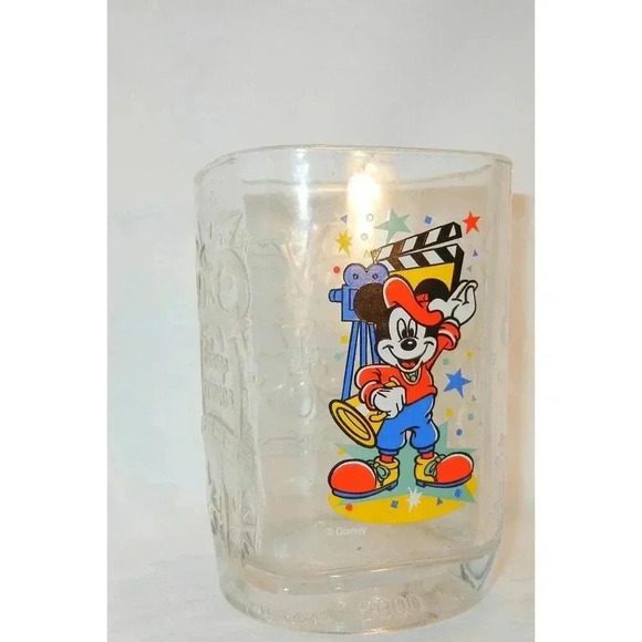 Walt Disney World - Mickey Mouse - Disney Studios 2000; 4.5" x 3.5". This is a four-sided glass with rounded corners. Each side is embossed with a different theme: WDW with 2000, WD Studios, and Hollywood and Vine street signs. The bottom reads 2000 WDW, Celebration, with the McDonald's symbol in the center. No chips or damage,in like-new condition.