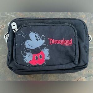 Walt Disney World Mickey Mouse Fanny Pack in Black. 3 separate compartments. Very Clean. All Nylon. Rear compartment to tuck away waist band. Can convert to crossbody but strap is missing. Did not come with wristlet strap. Please see pics for measurements. In Excellent Used Condition