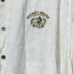 Get ready for a tropical paradise with this Walt Disney World Mickey Mouse in Paradise All Play And No Work Shirt. This cream-colored shirt features a solid/floral pattern with embroidered accents of Mickey Mouse, the famous Walt Disney character. The short-sleeved shirt has a collared neckline with a button closure and a regular fit, making it suitable for any casual occasion.