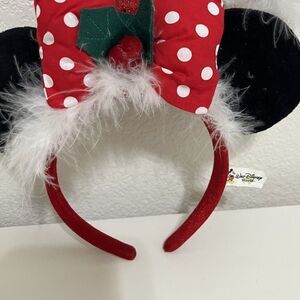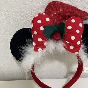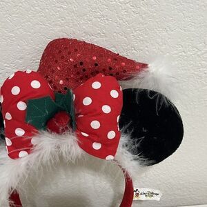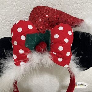Walt Disney World Minnie Mouse Red Sequin Christmas Hat Headband Black Ears Bow. Adorable Christmas Minnie Mouse ears with a red bow with white polka dots and holly in the middle. Red sequin Christmas Santa hat with white feather fluff details. Have been worn and I am not sure what they were like originally, but I think that there might be some of the white feather fluff missing from the left side of the headband. The feathers kinda shed everywhere too. Please see the pictures. No other issues that I can find and still is a great piece with a ton of life left.