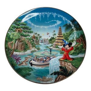 The Walt Disney World Plates 25th Anniversary Collector from Bradford Exchange celebrates the iconic Disney theme park with a set of plates featuring beloved characters and themes from Adventureland, Frontierland, and Main St USA.
