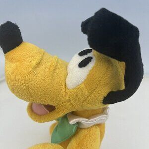 This is a really cute Walt Disney World Pluto plush stuffed animal. He is positioned where it looks like he’s sitting up and he has a fancy white collar and green bow tie. Walt Disney World castle stamp on bottom of one of his paws. He measures approximately 8 inches tall.