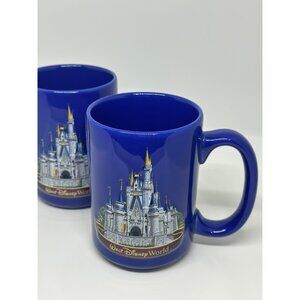 Set of 2 Walt Disney World souvenir mugs in deep blue, featuring raised relief graphics of the Magic Kingdom. A perfect collectible pair for any Disney fan.