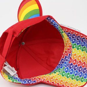 This is a brand new with tags Walt Disney World Rainbow Mickey Mouse Ear Baseball Hat. This adorable hat features a vibrant red canvas base, classic baseball cap style, adjustable back, vibrant rainbow striped embroidered Epcot Mickey Mouse patch, striped rainbow ears, rainbow Epcot Mickey Mouse pattern on the inner lining of the bill, and rainbow "Walt Disney World" embroidery on the back.