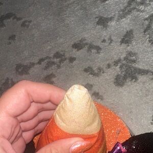 This adorable kids' headband features a vibrant orange and yellow witch hat with a cute purple bow, perfect for Halloween. The black sequined ears add a fun touch to any costume.