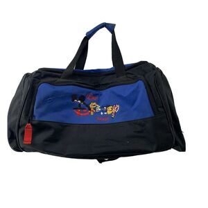 Walt Disney World Vintage Y2K X-Large Duffle Bag Travel Bag Character Font Black & Blue, Open Interior With Outer Pockets, Top Handles & Shoulder Strap.