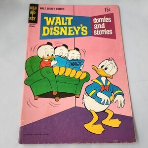 Relive childhood memories with this vintage Walt Disney's Comics and Stories comic book! This Gold Key edition from October 1969 transports you back to a simpler time, filled with the timeless charm of Donald Duck and his nephews. The vibrant cover art, featuring Donald and his nephews reading a magic book, evokes a sense of nostalgia and wonder. The interior pages are filled with classic Disney stories and vintage advertisements, offering a glimpse into the pop culture of the late 1960s. This comic book is a perfect addition to any Disney collection, a unique conversation starter, or a thoughtful gift for the Disney enthusiast in your life. Imagine displaying it proudly on your bookshelf, or sharing it with the next generation to introduce them to the magic of Disney comics.