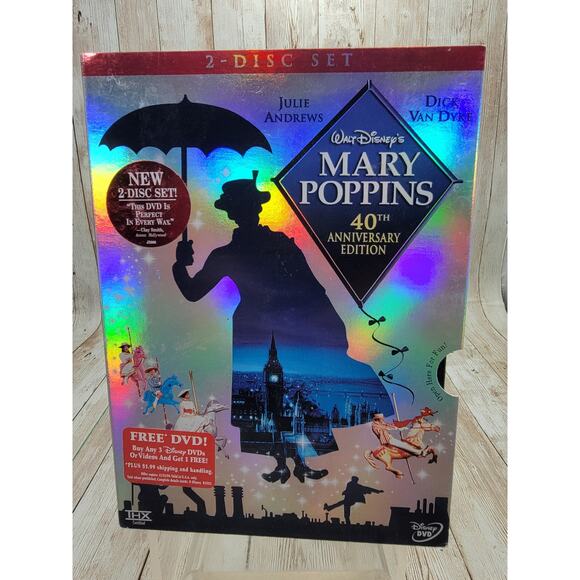 Walt Disney's MARY POPPINS 40th Anniversary Edition DVD 2004 2-Disc Set Item specifics Condition Brand New: An item that has never been opened or removed from the manufacturer’s sealing (if ... Read moreabout the condition Region Code DVD: 1 (US, Canada...) Language English Case Type Jewel Case: Standard Former Rental No Features Deleted Song, Behind The Scenes Featurette Country/Region of Manufacture United States Studio Disney UPC 0786936221916 Format DVD Release Year 2004 Actor Julie Andrews Rating G Director Robert Stevenson Sub-Genre Musical Genre Musical & Performing Arts Movie/TV Title Mary Poppins Edition 40th Anniversary Edition; 2-Disc Set