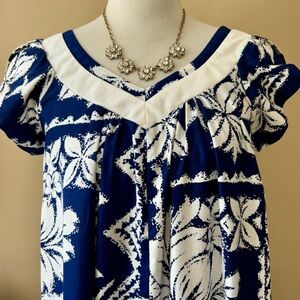 This vintage Hawaiian 60s 70s maxi-dress from Waltah Clarke Hawaiian Shops features a navy blue and white floral geometric print with short raglan cap dolphin sleeves, a portrait v-neckline with white trim, a maxi silhouette, unwaisted a-line skirt, pleated detailing, and a pull-over slip on style. 100% cotton. Unlined