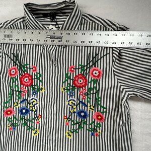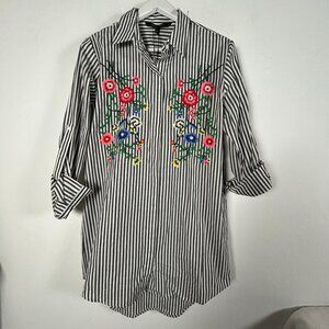 This stylish tunic combines classic stripes with vibrant floral embroidery for a versatile and chic look. Comfortable and elegant, perfect for day-to-night wear.