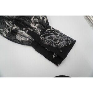 Pre-owned without tag Walter Baker Black & White Floral Botanical Print Blouse Ruffle Tie Neck Size S. This elegant blouse from Walter Baker is a sophisticated and stylish addition to any wardrobe. The top features a striking floral and botanical pattern in black, white, and shades of gray. The design includes a versatile tie neck detail that can be worn in a bow or left open, along with subtle ruffles down the front and at the cuffs. This piece is perfect for both professional settings and dressy casual occasions.