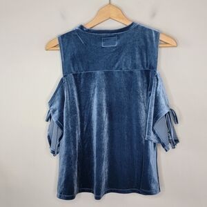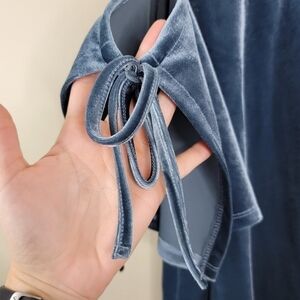 Gorgeous velvet look blue top with cold shoulder tie sleeves.