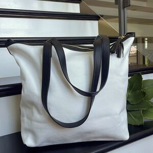 This brand-new Walter Baker Curateur tote is a modern, versatile carryall perfect for work, travel, or everyday style. Crafted in durable white canvas with sleek black genuine leather straps and trim, this bag offers a clean, high-contrast design that never goes out of style. The zip top closure keeps belongings secure, and the oversized tassel zipper pull adds a chic finishing touch. Interior is fully lined with a zip pocket and open compartments for organization.