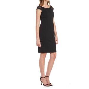 Stretch crepe sculpts a sheath dress that lets the neckline make the statement with a bateau neck and mesh-inset notches for added allure. True to size. - Hidden back-zip closure - Bateau neck - Cap sleeves. Lined - 94% polyester, 6% spandex - Hand wash, line dry - Imported - Special Occasion. Size 4.