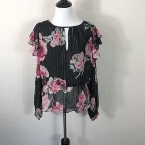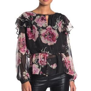 Walter Baker Evelyn floral blouse. Ruffle details, long sleeves, and a front keyhole complement this blouse. Hidden back zip.