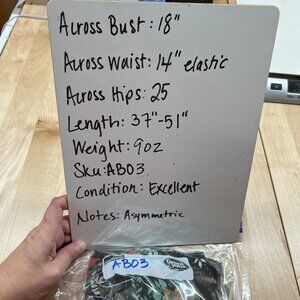 Excellent condition with no noticeable flaws. Measurements: Across Bust = 18", Across Waist = 14" (elastic), Across Hips = 25", Length = 37"-51".