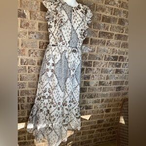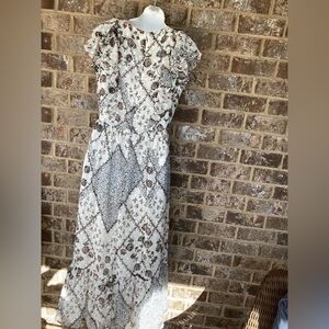 Walter Bakker, Lola, maxi dress, floral, ivory, vintage, rose, ruffle cap sleeve chiffon lined back zip slit, peep neckline. Women’s size 6. All measurements laying flat and approximate length shoulder to Hemline 52 inches. Armpit to armpit 18 inches. Items come from a smoke free home. Gently preowned condition with no known flaws.