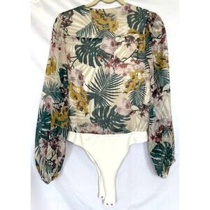 - Surplice neck - Long sleeves - Snap lined gusset - Thong cut - Allover floral print in shimmery gauzy fabric.