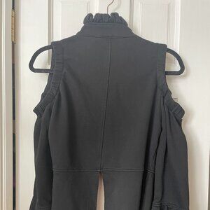 Sweatshirt style but with the twist - open shoulders, ruffle collar, peplum bottom and sleeves, back slit