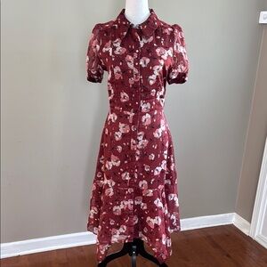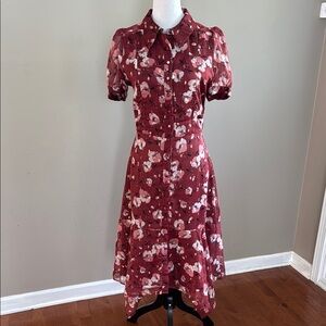 Walter Baker Smith Berry Hibiscus Burgundy Floral Handkerchief Hem Mide Dress S