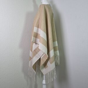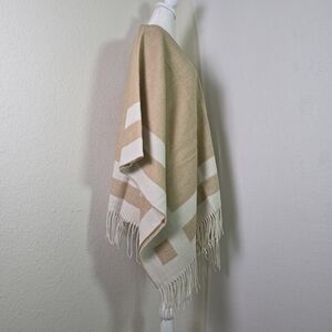 Cozy and chic Walter Baker Veruschka Poncho in a timeless camel and ivory colorway. Features an open-front design with ivory stripe accents, soft acrylic knit, and fringe hem. Perfect for layering in fall and winter. One size fits most.