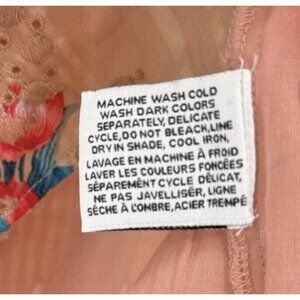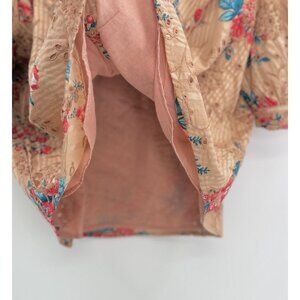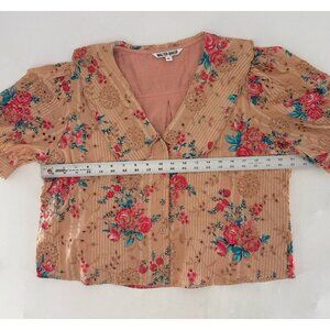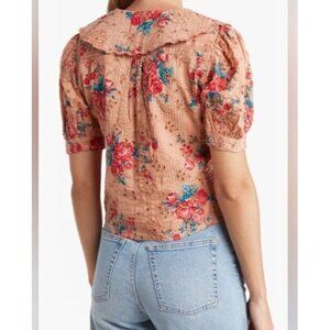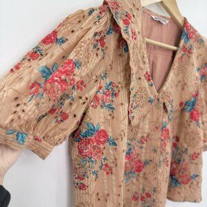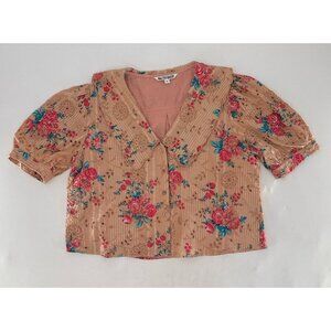 The Walter Baker Women's Irma Top is a bohemian-inspired blouse in size XL. This floral patterned top features a V-neckline, short puff sleeves, and a button closure. Made from 100% cotton knit fabric, this breathable blouse is suitable for various occasions such as travel, weddings, parties, casual wear, and work attire. The multicolor botanical eyelet design adds a festive and peasant-inspired touch, perfect for summer, fall, and spring seasons. Handmade in India, this stylish and comfortable top by Walter Baker offers a regular fit for a chic and versatile addition to any wardrobe. Good used condition. No stains or holes found. Please feel free to ask any questions.