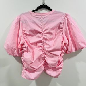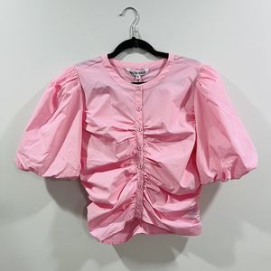 Walter Baker XS Ruched Janet Top Pink Button Cotton Poplin $158 W53468 Easter Elevate your every day style with the Janet Top! It's puff sleeves and shirring detail add a chic touch whether you pair it back to jeans or one of our sassy leather bottoms Crew neck; Button down closure; Fitted shape; Side, center back and front placket shirring detail; Short balloon sleeves; Fully lined Cotton Poplin 100% Cotton Hand wash cold separately, Do not bleach, Do not tumble dry, Hang to dry, Cool iron if needed, For best results dry clean