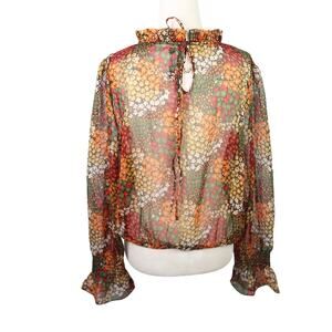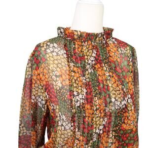 Walter Baker orange, green, brown, red, yellow, and cream ditsy floral sheer blouse top. Frilly high neck. Ties at back of neck. Elastic at hem and cuffs. Pintuck detail in front. Long sleeves.