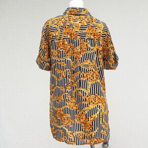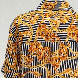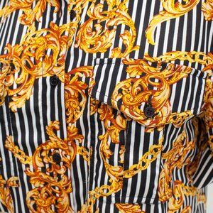 The pattern is black and white stripe with a print overlay of gold filagree and chain.