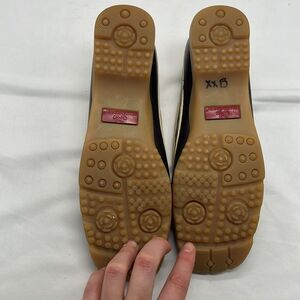 This is a great pair of Walter Genuin tan and brown leather women's golf shoes! Made in Italy. There are some barely noticeable stains on tan fabric, please see pictures.