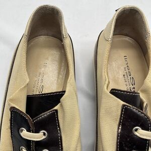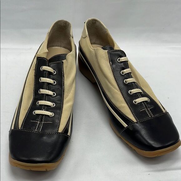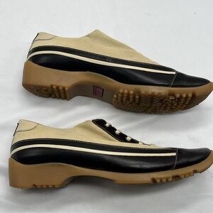 This is a great pair of Walter Genuin tan and brown leather women's golf shoes! Made in Italy. There are some barely noticeable stains on tan fabric, please see pictures.