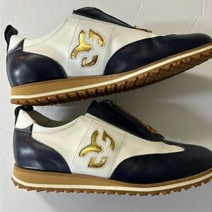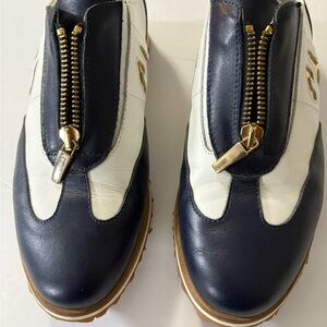 Made in Italy luxury woman’s leather golf shoes with zipper closure. Navy and white with gold accents.