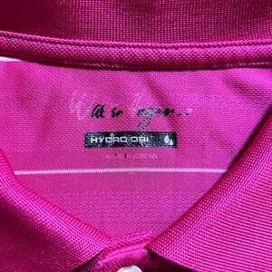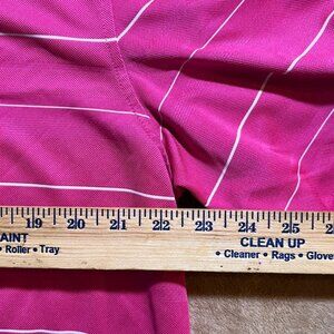 Elevate your golfing attire with the Walter Hagen Men's Large Pink Stripe Hydro-Dri Golf Performance Short Sleeve Polo. This premium polo is expertly crafted for the golf enthusiast, featuring a striking pink base complemented by crisp horizontal stripes for a classic yet contemporary look on the course. The innovative Hydro-Dri technology is integrated into the fabric to wick away moisture, ensuring you stay dry and comfortable throughout your game. Its tailored fit and short sleeve design allow for unrestricted movement, making it perfect for swinging with ease. The durable, soft material offers breathability and resilience, making it a reliable choice for regular wear. A neat, pointed collar and a traditional three-button placket lend this polo a touch of sophistication.